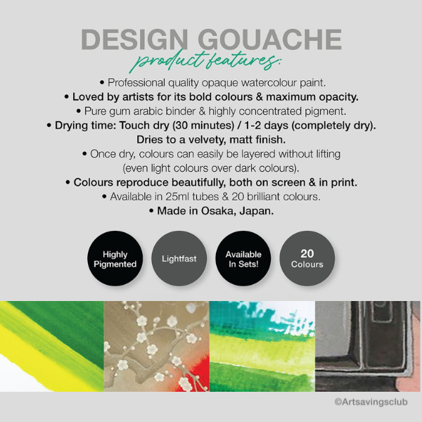 Turner Design Gouache is widely considered to be the very finest produced in the world today. For artists seeking an opaque Watercolour, it offers an incredibly vivid line of colours that dry to an opaque matt finish. Unique non bleeding feature allows you to paint light or white colours over dark when dry. Colours dry to a velvety finish showing no brush marks. By using a dry brush technique you can even achieve smoother and thinner layers. These colours employ the Munsell System to make colour mixing extremely easy. These colours are constantly improved to be brilliant beyond comparison.