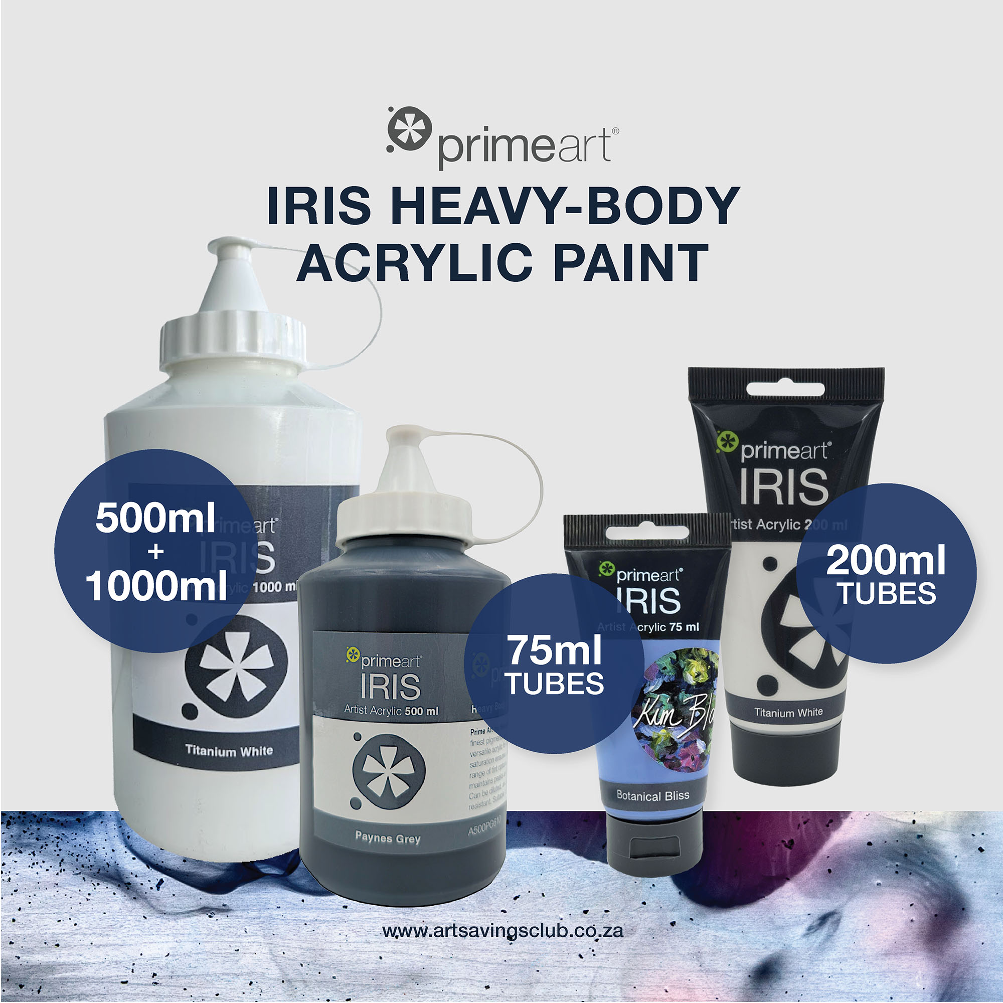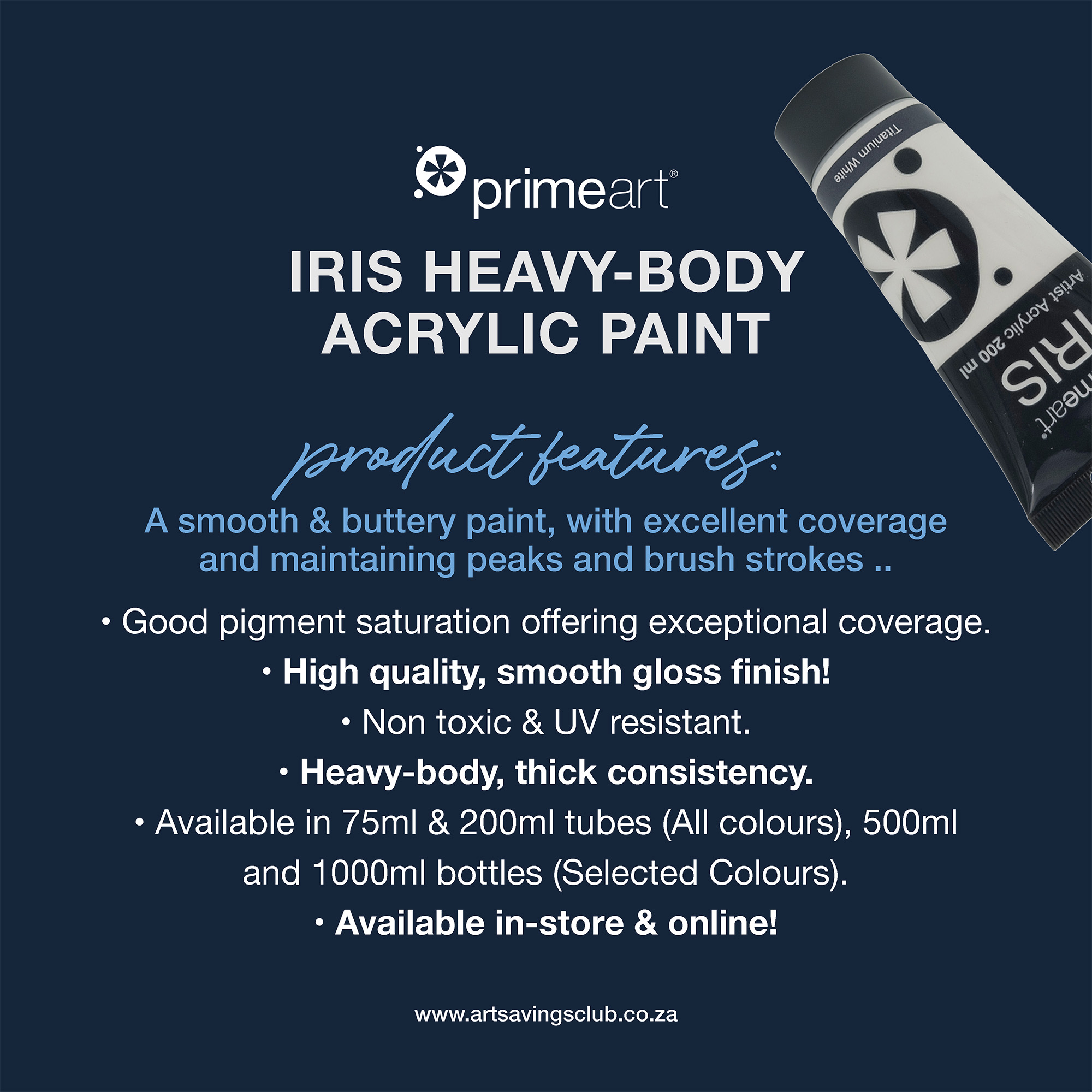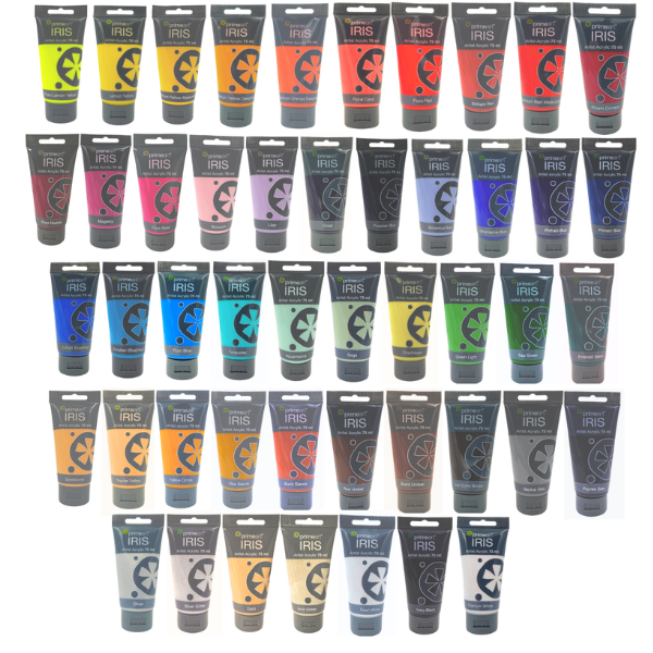 By combining the finest pigments, superior binding and modern manufacturing techniques, Iris Acrylics give you excellent coverage, peak to maintain brush strokes and are saturated with pigment to provide a wide range of tints.