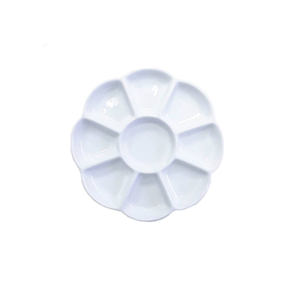 This beautiful daisy-shaped 9-well porcelain palette is suitable for all watercolour, acrylic and water-based paints and mediums. It is heavy enough to not move on a desk or table. The 19.5cm size palette will make mixing colours easy plus the porcelain is quick to clean and won’t stain. Most watercolour artists prefer porcelain palettes as colours and washes don’t “bead” on the surface as they do with plastic palettes.