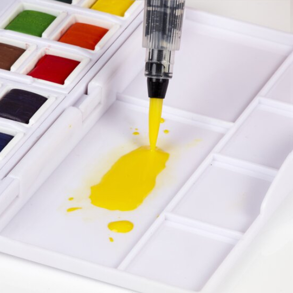 - Colour Palette: Lemon Cadmium, Deep Cadmium, Mango, Orange, Poppy Red, Madder Carmine, Magenta, Dark Violet, Amethyst, Ultramarine, Spectrum Blue, Kingfisher Blue, Jade Green, Bottle Green, Emerald Green, Grass Green, Olive Green, Raw Sienna, Copper Beech, Terracotta, Chocolate, Payne’s Grey, Ivory Black, White.