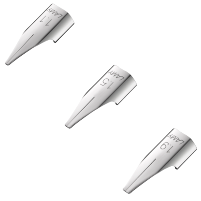 Premium replacement calligraphy nibs for LAMY Joy fountain pens, available in three professional widths (1.1mm, 1.5mm, 1.9mm) for versatile lettering styles. Crafted from polished stainless steel with precision-ground tips for smooth, consistent ink flow.