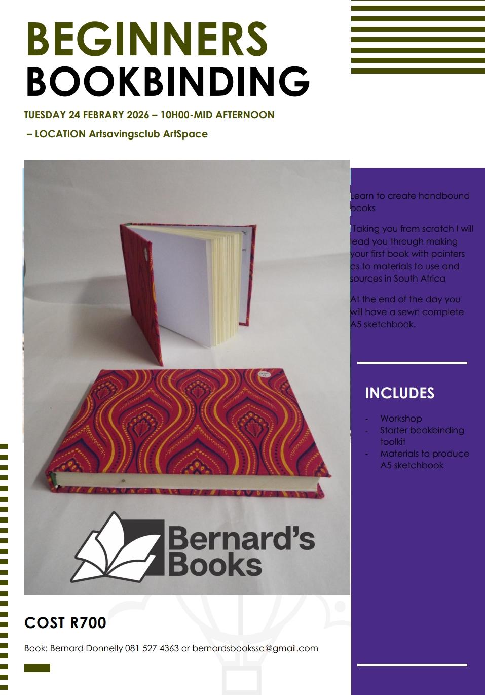 Bernards Books Beginners bookbinding workshop with Bernard Donnelly R700 pp    (includes starter bookbinding toolkit and materials to produce A5 sketchbook) ArtSpace Artsavingsclub 4th Avenue, Linden Tues 24th February 2026 […]