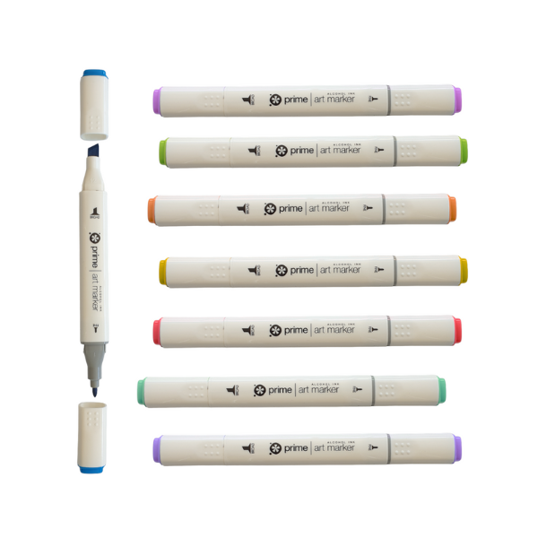 Prime Art Markers | 000 Colorless Blender, 001 Wine Red, 003 Rose Red, 006 Vivid Pink, 009 Pale Pink, 00G Gold, 00S Silver, 013 Scarlet, 015 Cranberry, 022 French Vermillion, 023 orange, 024 Marigold, 025 Salmon Pink, 029 Bareley Beige, 035 Lemon Yellow, 037 Pastel Yellow, 038 Pale Yellow, 042 Bronze Green, 046 Vivid Green, 047 Grass Green, 048 Yellow Green, 052 Deep Green, 055 Emerald Green, 057 Turquoise Green Light, 059 Pale Green, 063 Cerulean Blue, 064 Indian Blue, 065 Ice Blue, 067 Pastel Blue, 069 Prussian Blue, 070 Royal Blue, 071 Cobalt Blue, 081 Deep Violet, 083 Lavender, 087 Azalea Purple, 092 Chocolate, 098 Chestnut Brown, 100 Studio Walnut, 102 Raw Umber, 103 Potato Brown, 120 Black, 132 Milky White, 144 Pale Baby Blue, 179 Aqua Mint, 198 Tender Pink, BG1 Blue Grey 1, BG2 Blue Grey 2, BG5 Blue Grey 5, BG7 Blue Grey 7, BG9 Blue Grey 9, CG1 Cool Grey 1, CG2 Cool Grey 2, CG3 Cool Grey 3, CG4 Cool Grey 4, CG5 Cool Grey 5, CG6 Cool Grey 6, CG7 Cool Grey 7, CG8 Cool Grey 8, CG9 Cool Grey 9, GG3 Green Grey 3, GG5 Green Grey 5, GG7 Green Grey 7, GG9 Green Grey 9, WG1 Warm Grey 1, WG2 Warm Grey 2, WG3 Warm Grey 3, WG4 Warm Grey 4, WG5 Warm Grey 5, WG6 Warm Grey 6, WG7 Warm Grey 7, WG8 Warm Grey 8, WG9 Warm Grey 9, BG3 Blue Grey 3 |