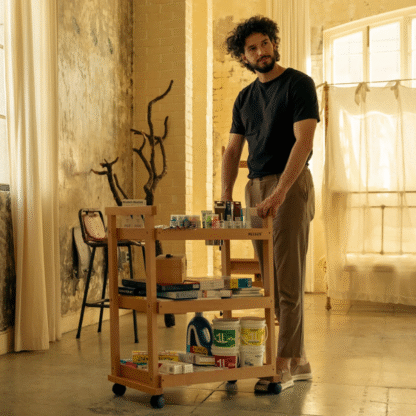 This compact yet sturdy cart features three open shelves, perfect for storing paints, brushes, palettes, and other essential art tools. The oil-finished, hand-sanded beechwood ensures a smooth and safe surface, while 360° swivel wheels – two with locking brakes – make mobility effortless. The ridged top shelf with a built-in paint cup holder keeps your supplies secure during movement. Lightweight yet robust, it supports up to 40 kg.