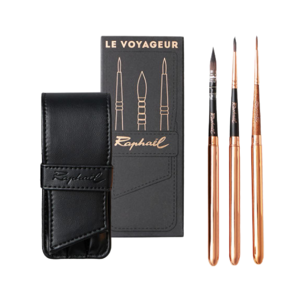 Raphaël Le Voyageur brushes are designed for artists who like to travel light without sacrificing control or quality. This compact set includes three reversible travel brushes, each with a protective metal handle that doubles as a cap. When closed, the brush head is safely stored inside the handle, making them ideal for sketching, painting, and working outdoors or on the move. The sleek black case keeps everything organised and well protected, because loose brushes in a backpack never end well.