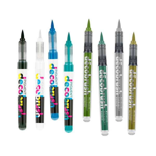 For extra sparkle, the DecoBrush Metallic markers add a shimmering finish that truly stands out. Made with metallic pigments, these colours catch the light in stunning ways and look especially striking on dark or tinted surfaces. They’re ideal for cards, decorative details, and lettering with a touch of brilliance.