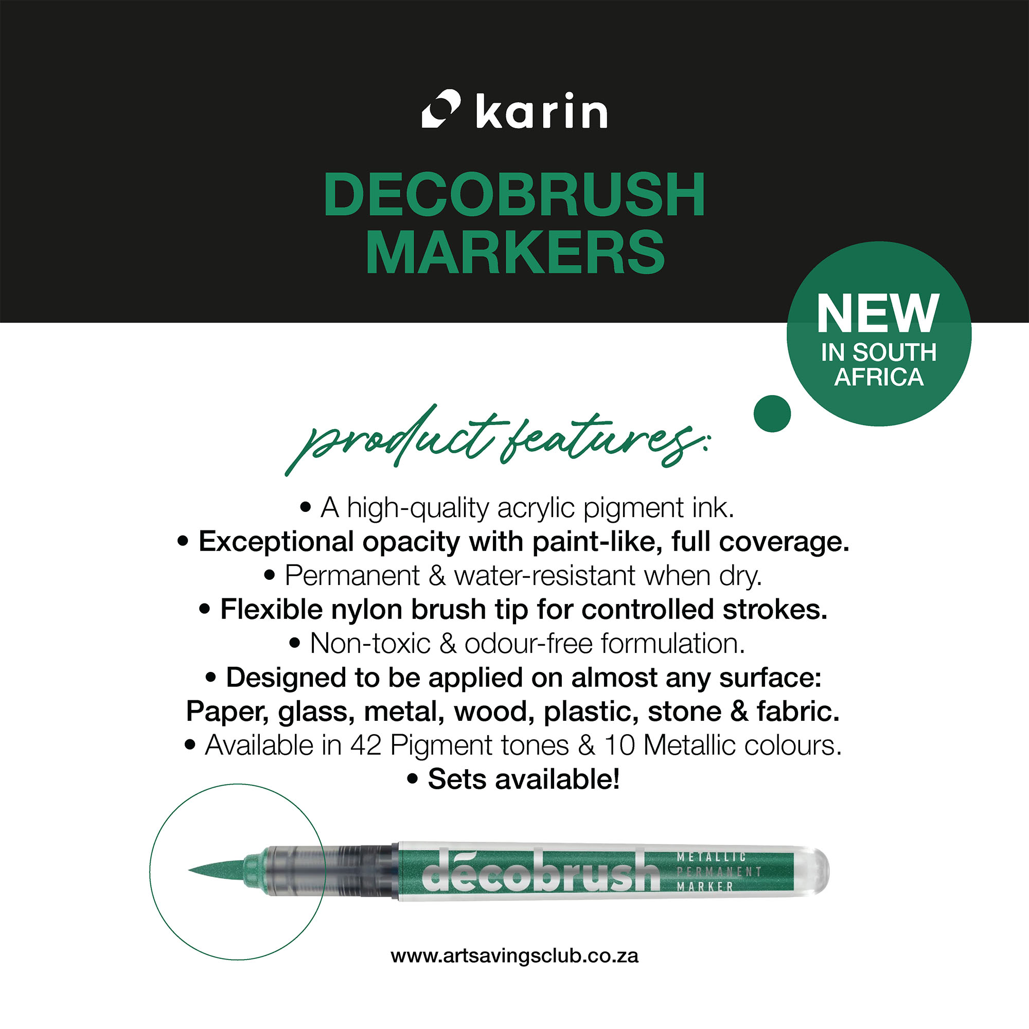 PIGMENT DecoBrush markers are similar to acrylic paints, but are packaged in a convenient marker format with a flexible, nylon brush tip. Their opaque paint can be used on paper, metal, glass, plastic, wood, textiles, and many other materials. Their opaque, matte paint also allows them to be used on dark surfaces using techniques previously unavailable with other markers. PIGMENT DecoBrush markers contain 2.4 ml of opaque, non-toxic acrylic paint based on organic pigments. They are manufactured using “liquid ink” technology, which, unlike traditional methods, allows for 100% paint consumption.