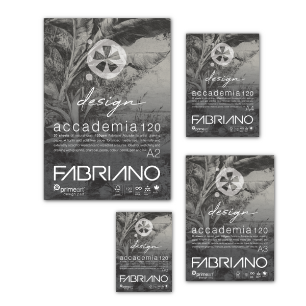 The Prime Art Design pad is made with 20 sheets of natural grain 120gsm Fabriano Accademia artist drawing paper. The white paper has a fine grain and allows graphite, charcoal, colour pencil, and pastels to adhere to the surface with ease, but if you prefer ink, the natural grain surface would not stand in the way of fine line work.