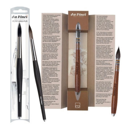 Da Vinci’s Ethergraf brushes combine traditional squirrel-hair craftsmanship with a built-in metalpoint tip, creating versatile tools for both painting and drawing. Each brush features a pure blue squirrel hair head shaped by hand, offering exceptional water absorption and a smooth, even release ideal for expressive watercolour work and broad washes. The opposite end of each handle carries an Ethergraf metalpoint tip, made by Italian specialists at SIGNATURE S.r.l., allowing artists to sketch fine lines on many paper types.