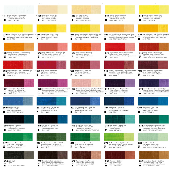 Series 1: Classic colours with excellent lightfastness. Includes essential whites, earth tones, and a wide range of primary and secondary colours.
