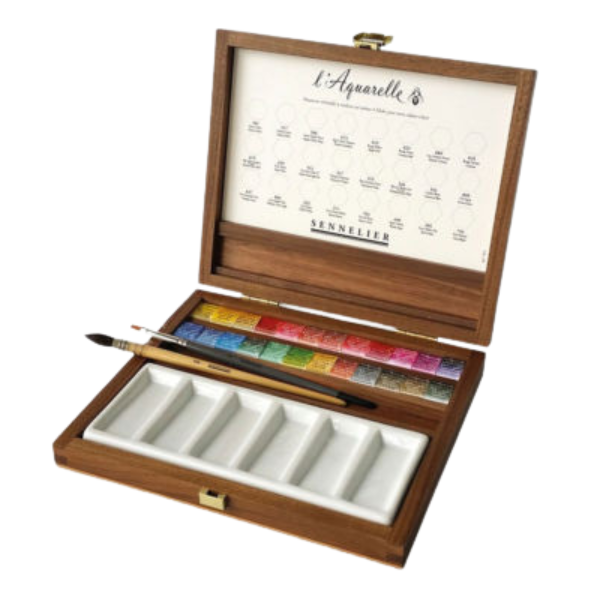 Includes Lemon Yellow, Indian Yellow, Naples Yellow Deep, French Vermilion, Bright Red, Venetian Red, Alizarin Crimson, Quinacridone Red, Carmine, Opera Rose, Cobalt Violet Light Hue, Dioxazine Purple, Ultramarine Deep, Phthalo Blue, Cinereous Blue, Forest Green, Viridian Green, Phthalo Green Light, Yellow Ochre, Burnt Sienna, Payne’s Grey, Warm Sepia, Raw Umber, and Ivory Black half pan watercolours, a size 3/0 Raphael Soft Aqua Quill Brush, size 6 Raphael Soft Aqua Round Brush, and a porcelain palette housed in a Walnut Case.