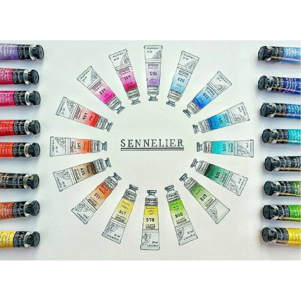 Chinese White (112) – S1, Titanium White (116) – S1, Burnt Umber (202) – S1, Greenish Umber (203) – S1, Raw Umber (205) – S1, Raw Sienna (208) – S1, Burnt Sienna (211) – S1, Green Earth (213) – S1, Yellow Ochre (252) – S1, Light Yellow Ochre (254) – S1, Gold Ochre (257) – S1, Indigo (308) – S1, Prussian Blue (318) – S1, Royal Blue (322) – S1, Phthalocyanine Blue (326) – S1, Cinereous Blue (344) – S1, Blue Sennelier (399) – S1, Van Dyck Brown (407) – S1, Transparent Brown (435) – S1, Warm Sepia (440) – S1, Raw Sepia (443) – S1, Brown Pink (445) – S1, Lemon Yellow (501) – S1, Indian Yellow (517) – S1, Yellow Lake (561) – S1, Naples Yellow Deep (566) – S1, Naples Yellow (567) – S1, Primary Yellow (574) – S1, Sennelier Yellow Light (578) – S1, Sennelier Yellow Deep (579) – S1, Yellow Sophie (587) – S1, Venetian Red (623) – S1, Alizarin Crimson (689) – S1, Payne's Grey (703) – S1, Warm Grey (705) – S1, Light Grey (707) – S1, Sennelier Grey (709) – S1, Lamp Black (753) – S1, Ivory Black (755) – S1, Phthalo. Green Light (805) – S1, Phthalo. Green Deep (807) – S1, Hooker's Green (809) – S1, Olive Green (813) – S1, Sennelier Green (817) – S1, Sap Green (819) – S1, Emerald Green (847) – S1, Forest Green (899) – S1, Caput Mortum (919) – S1, Neutral Tint (931) – S1, Ultramarine Light (312) – S2, French Ultramarine Blue (314) – S2, Ultramarine Deep (315) – S2, Phthalocyanine Turquoise (341) – S2, Scarlet Laquer (612) – S2, Bright Red (619) – S2, Sennelier Red (636) – S2, Sennelier Orange (641) – S2, Opera Rose (659) – S2, French Vermilion (675) – S2, Rose Madder Lake (690) – S2, Rose Dore Madder Lake (691) – S2, Permanent Alizarin Crimson Deep (699) – S2, Brown Green (857) – S2, Bright Yellow Green (871) – S2, Blue Violet (903) – S2, Cobalt Violet Light Hue (911) – S2, Cobalt Violet Deep Hue (913) – S2, Blue Indanthrene (395) – S3, Perylen Brown (499) – S3, French Ochre (565) – S3, Quinacridone Gold (599) – S3, Carmine (635) – S3, Red Orange (640) – S3, Chinese Orange (645) – S3, Helios Purple (671) – S3, Quinacridone Red (679) – S3, Permanent Magenta (680) – S3, Crimson Lake (688) – S3, Alizcrimson Lake (695) – S3, Chromium Oxide Green (815) – S3, Viridian Green (837) – S3, Red Violet (905) – S3, Dioxazine Purple (917) – S3, Cerulean Blue (302) – S4, Cerulean Blue Red Shade (305) – S4, Cobalt Blue (307) – S4, Cobalt Deep (309) – S4, Cadmium Yellow Light (529) – S4, Cadmium Yellow Deep (533) – S4, Cadmium Lemon Yellow (535) – S4, Cadmium Yellow Orange (537) – S4, Aureoline (559) – S4, Nickel Yellow (576) – S4, Cadmium Red Light (605) – S4, Cadmium Red Purple (611) – S4, Cadmium Green Light (823) – S4, Turquoise Green (843) – S4, Cobalt Green (856) – S4, Iridescent Gold (028) – S4, Iridescent Silver (029) – S4, Iridescent Copper (036) – S2, Iridescent Light Blue (037) – S2, Iridescent Phthalo Blue (038) – S2, Iridescent Yellow (054) – S2, Iridescent Orange (060) – S2, Iridescent Vermilion (061) – S2, Iridescent Green (080) – S2, Iridescent Yellow Green (081) – S2, Iridescent Light Purple (090) – S2, Iridescent Purple (091) – S2
