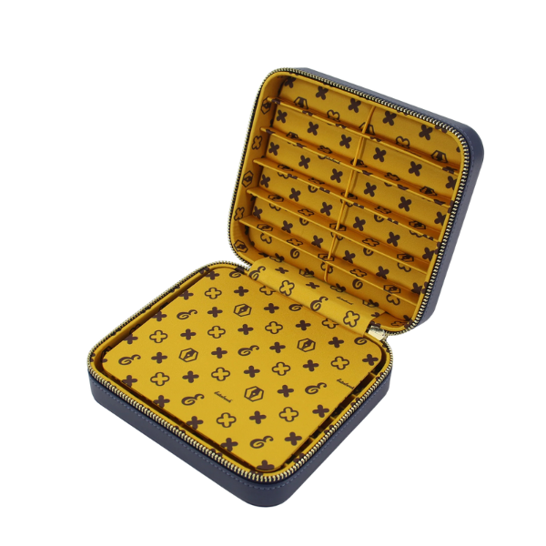 A rectangular case with a center-placed gold zipper, opening flat like a book. Three pen slots on each side are divided by a printed interior flap. - Twelve-Pen NOOK: