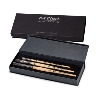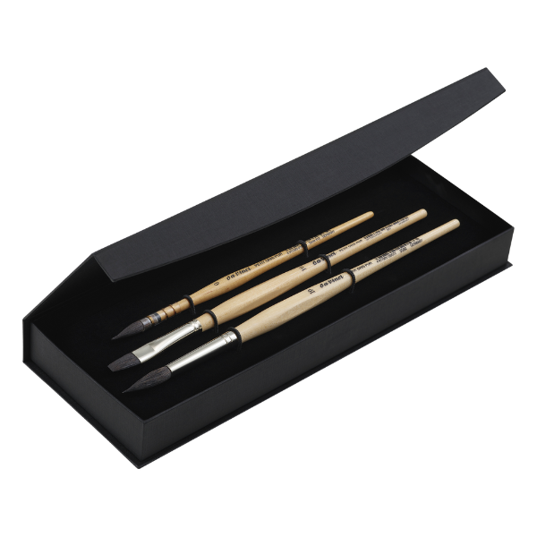 This set comes in a gift box with magnetic snap including three brushes in series 418 Quill size 0, series 991 Flat Wash size 10 and series 5590 Round size 10.