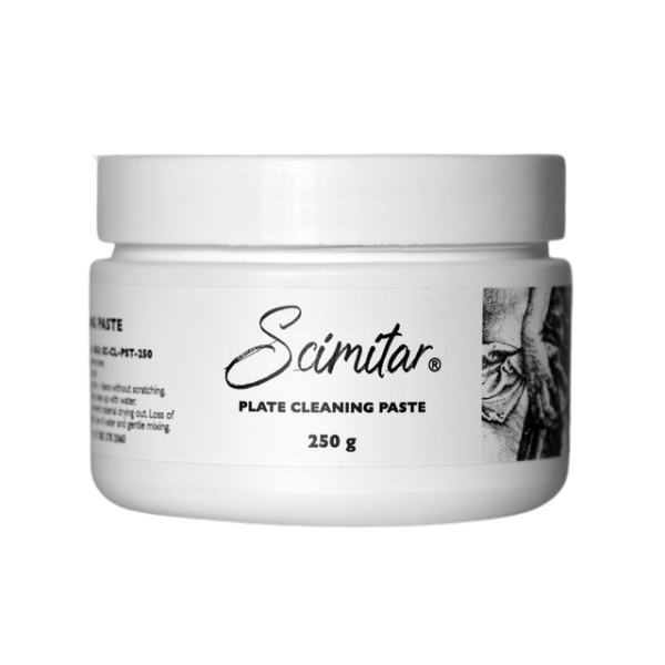 Supplied in a 250 ml PE plastic tub with a secure screw-on lid, Scimitar Plate Cleaning Paste is a versatile, economical, and dependable addition to any printmaker’s toolkit.