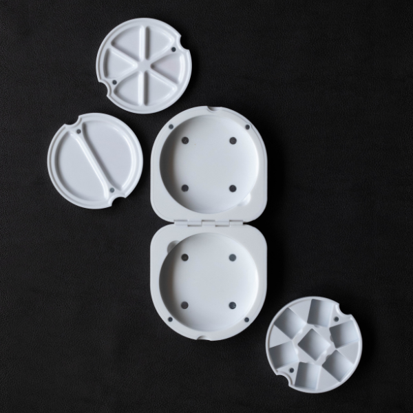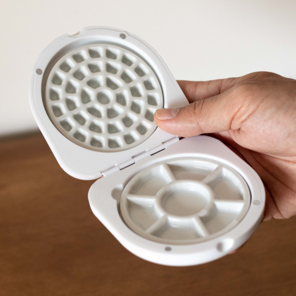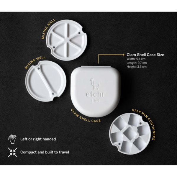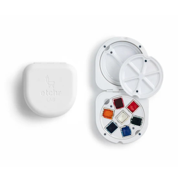 The Pocket Palette is a compact watercolour case designed for travel and everyday use. It holds 7 half-pans and 2 mixing wells with a modular, magnetic system that makes it easy to customise. Built from durable, stain-resistant hardened polystyrene, it’s lightweight, portable, and compatible with most leading half-pan brands. Use it on its own or pair it with the Etchr Mini Palette (19 or 37 wells) for even more colour capacity.