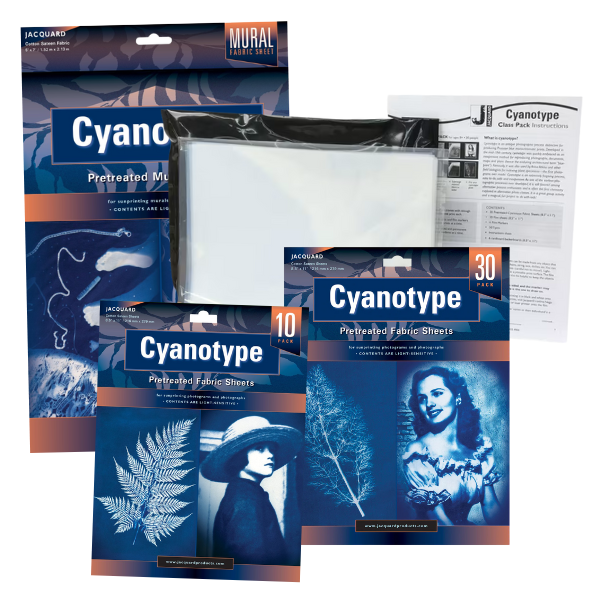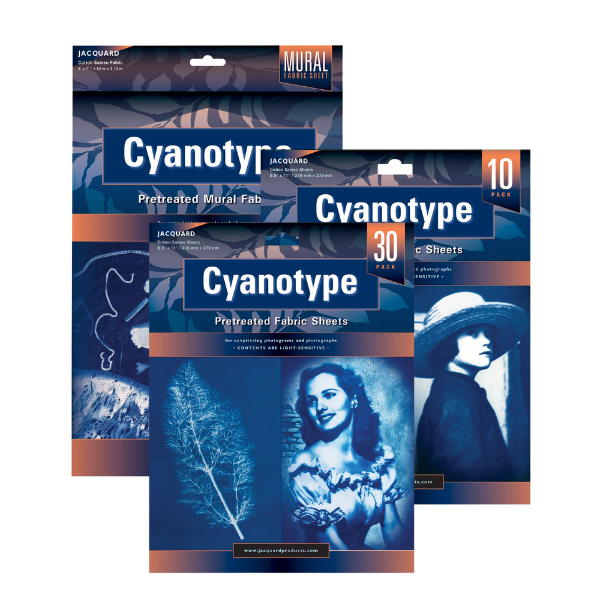 Cyanotype is an antique photographic printing process, developed in the mid 1800’s and distinctive for its rich blue colour. Jacquard’s high-quality cotton sateen fabric sheets come pre-sensitized for cyanotype and ready to use, making sun printing easier than ever before. Just pull a sheet out of the package, place objects or film on top, expose to light, rinse and dry and you’ll have a rich, detailed print.
