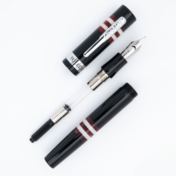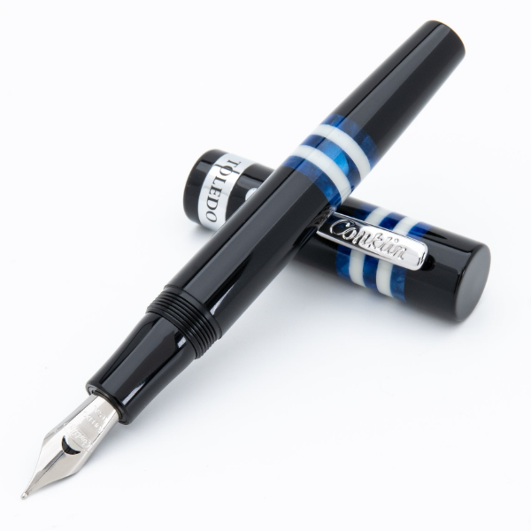 Inspired by the classic designs of the early Conklin era, each Toledo fountain pen features a sleek, glossy black body crafted from premium European-grade resin. Colourful resin ring segments on the cap and barrel provide striking visual contrast, available in three sophisticated combinations: Burgundy & White, Orange & White, and Blue & White. The signature flat-top cap, first introduced in 1924, is complemented by chrome trim accents, enhancing the pen’s elegant and timeless aesthetic.