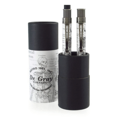 A homage to Dr Henry Gray and to human anatomy on a vintage pen. This vintage metal capless rollerball acts as an ode to Dr Henry Gray, as well as his book on human anatomy. Each pen features the Dr Gray skeleton with an acid-etched lacquer finish barrel that is highlighted with antique silver accents. It even glows in the dark! Just as smooth as its rollerball cousin, the Retro 51 Tornado glow in the dark Dr Gray 1.15mm pencils operate with a simple twist on the top, plus there is a huge eraser on top for those who make an occasional mistake.
